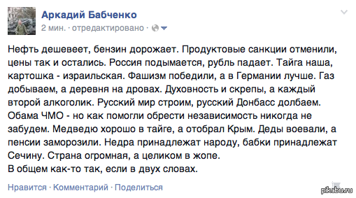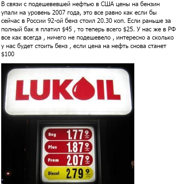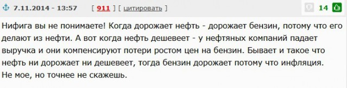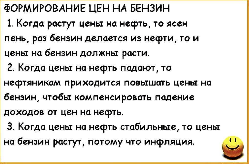 Даже без девальвации рубля и падения цен на нефть «налоговый манёвр», который придумали в Минфине, позволяет постоянно расти ценам на бензин на внутреннем рынке. Власть нам обещала сохранить либо ежегодно индексируемый акциз, либо транспортный налог. В итоге платим оба побора, к которым добавились «Платон», повышенный НДС, платные дороги и т. д. Очевидно, что нас постоянно дурят, когда говорят про зависимость цен от внешнего рынка. В России искусственно созданная ситуация, когда выгодно гнать сырьё и топливо за пределы страны, а не перерабатывать его и продавать на внутреннем рынке не по задранным ценам.