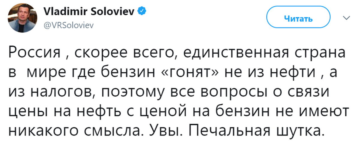 К сожалению, мы можем по заявлениям «Коммерсанта» видеть, что те «эксперты», которые пытаются судить о нефтяном рынке, они, наверное, эксперты, но только в области балета, а вовсе не нефтяного рынка, потому что на самом деле в России цены на нефть повлиять на цены на бензин не могут вообще никак. В принципе не могут уже хотя бы потому, что рынка бензина и дизтоплива в России просто нет с 2018 года, это давным-давно уже забытая ситуация. Поэтому необходимо восстанавливать рынок, а потом говорить о влиянии,