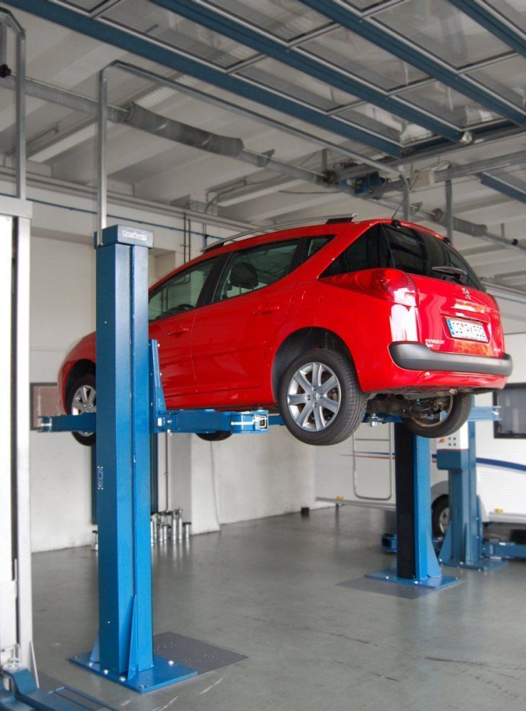 В ремонтных мастерских и на станциях технического обслуживания для поднятия автомобилей используются подъемники двухстоечные. В отличие от одностоечных, они более устойчивы и могут поднимать машины весом до 5 тонн. Это позволяет обслуживать не только легковые, но и грузовые авто.
