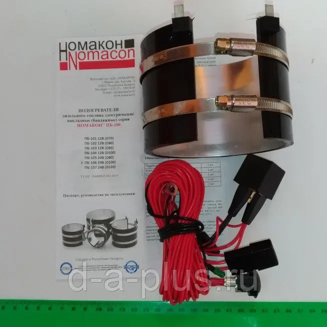 Электрический проточный подогреватель дизельного топлива автомобиля.Предназначен для использования в легковых и грузовых автомобилях с дизельным двигателем.Устанавливается в разрез топливной магистрали на минимальном удалении от фильтра тонкой очистки топлива.Подогреватель растворяет выпавшие парафины,предотвращает затруднение подачи топлива к насосу ТНВД.
