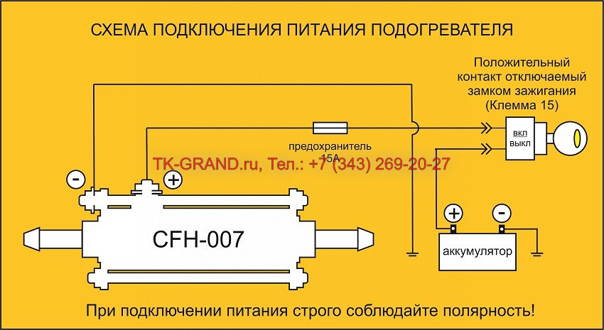 В электрическую цепь питания подогревателя необходимо установить переключатель «зима-лето» и предохранитель 15А.Подогреватель необходимо подключить к бортовой электросети автомобиля,к контакту который обесточевается при выключении замка зажигания.При подключении проводов питания строго соблюдайте полярность/
