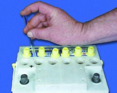 Чтобы освободить батарею и обеспечить себе доступ к банкам, нужно изъять клеммы и переместить конструкцию на ровную поверхность. Затем следует снять защитную полоску и отвинтить пробки на банках.