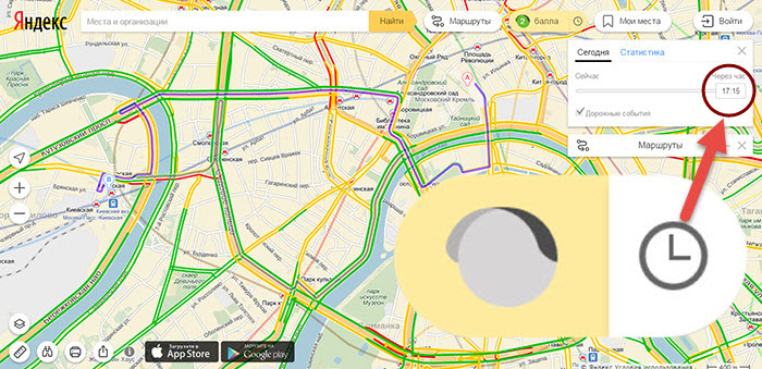 Маршрут будет перестроен с учетом заданных параметров. Чтобы перестроить маршрут на текущее время, нажмите Сейчас внизу экрана.