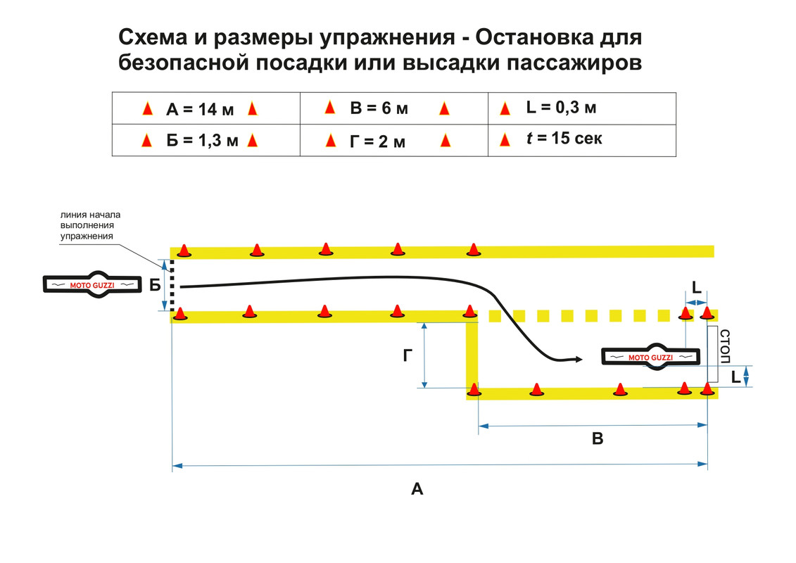 Необходимо объехать все вешки, не задев их и не пересекая сплошные боковые линии.