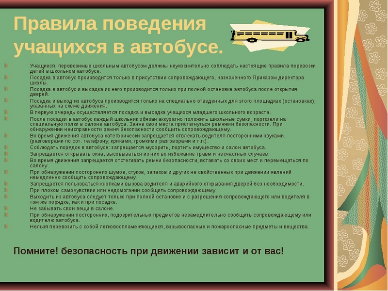 Заказанный автобус, предназначенный для перевозки детей, должен иметь медицинскую аптечку, огнетушитель, предупреждающие знаки «Перевозка детей». В случае их отсутствия необходимо требовать у фирмы замену транспорта.