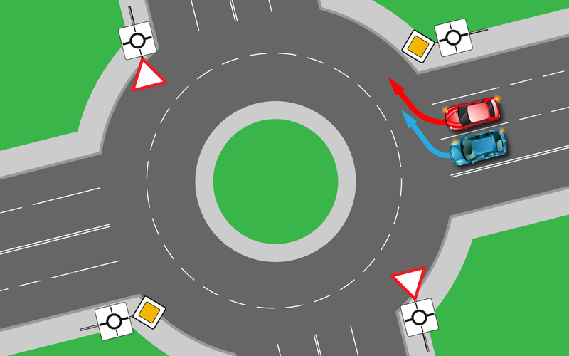 • Если две машины выезжают на кольцевую развязку одновременно, то преимущество имеет машина справа (аналогично остановке с четырехсторонним движением или перекрестку без дорожных знаков).