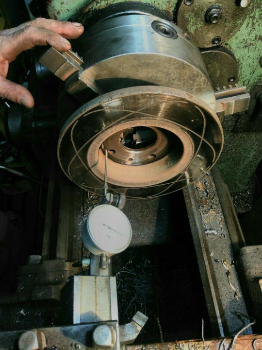 Колесо полностью разбирается, освобождается тормозной диск и устанавливается на токарный станок. Такую процедуру может произвести только профессиональный токарь. Данный метод подразумевает максимальную точность проточки с минимальными потерями метала на самом диске.