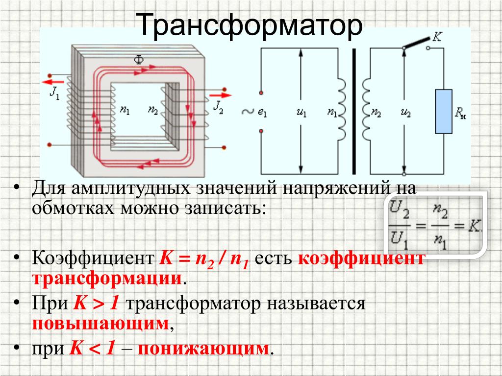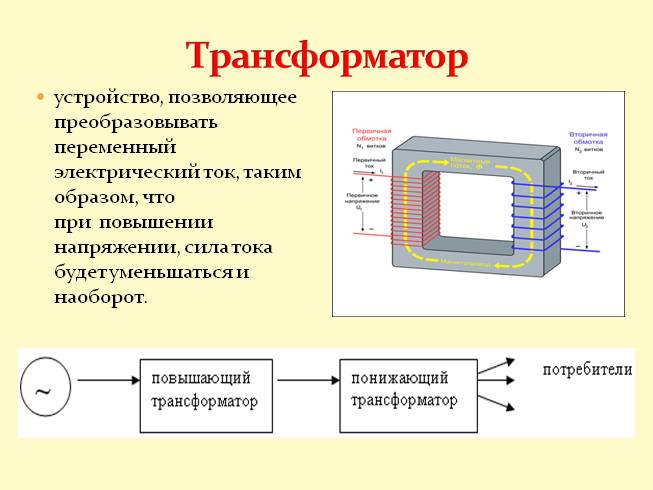 Одно из важных преимуществ переменного тока перед постоянным заключается в том, что напряжение переменного тока относительно легко поддается изменению с помощью электромагнитной индукции, а способы преобразования постоянного тока сложны. Прибор для преобразования напряжения и силы переменного тока при неизменной частоте называют трансформатором рис. Он был изобретен П. Яблочковым в Трансформатор состоит из замкнутого сердечника, сделанного из мягкой стали или феррита, на котором имеются две изолированные друг от друга катушки их называют обмотками с разным числом витков. Первичная обмотка включается в сеть переменного тока, а вторичная — соединяется с потребителем. Ток в первичной обмотке создает в сердечнике переменный магнитный поток рис.