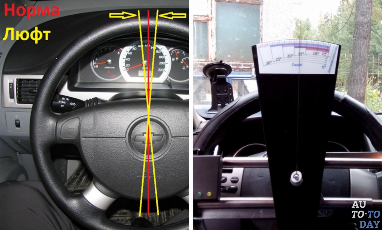 Суммарным люфтом в рулевом управлении считается угол поворота рулевого колеса от положения, соответствующего началу поворота управляемых колес в одну сторону от исходного положения, до положения, соответствующего началу их поворота в противоположную сторону.
