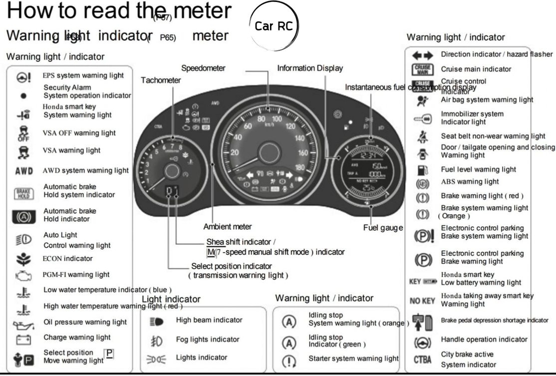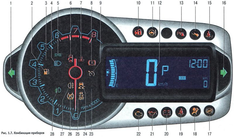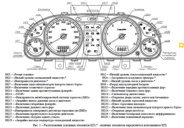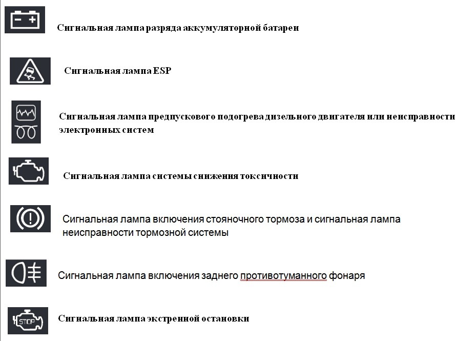 Ниже представлено обозначение и расшифровка всех ламп, индикаторов, расположенных на щитке автомобиля.