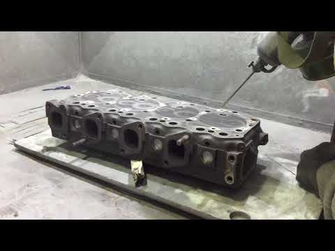 Многие трещины ГБЦ возникают из-за перегрева и локализуются в области водяной рубашки или на седлах клапанов. Трещины водяной рубашки иногда трудно увидеть. Если в месте шлифовки трещину трудно увидеть, рекомендуется использовать тест на проникающую способность красителя. Баллон с пенетрантом можно купить в любой сварочной мастерской. Распылите краску вдоль трещины, а затем протрите распыленный участок. Остается только краситель, впитавшийся в трещину. Следующим шагом является нанесение проявителя, снова аэрозольного баллончика, который можно купить, но аэрозольный порошок для ног хорошо подойдет. Распылите ровный тонкий слой на область. Белый порошок высыхает, обнажая красно-розовую линию, показывающую, где находится трещина. Когда закончите осмотр, хорошо очистите участок обезжиривателем.