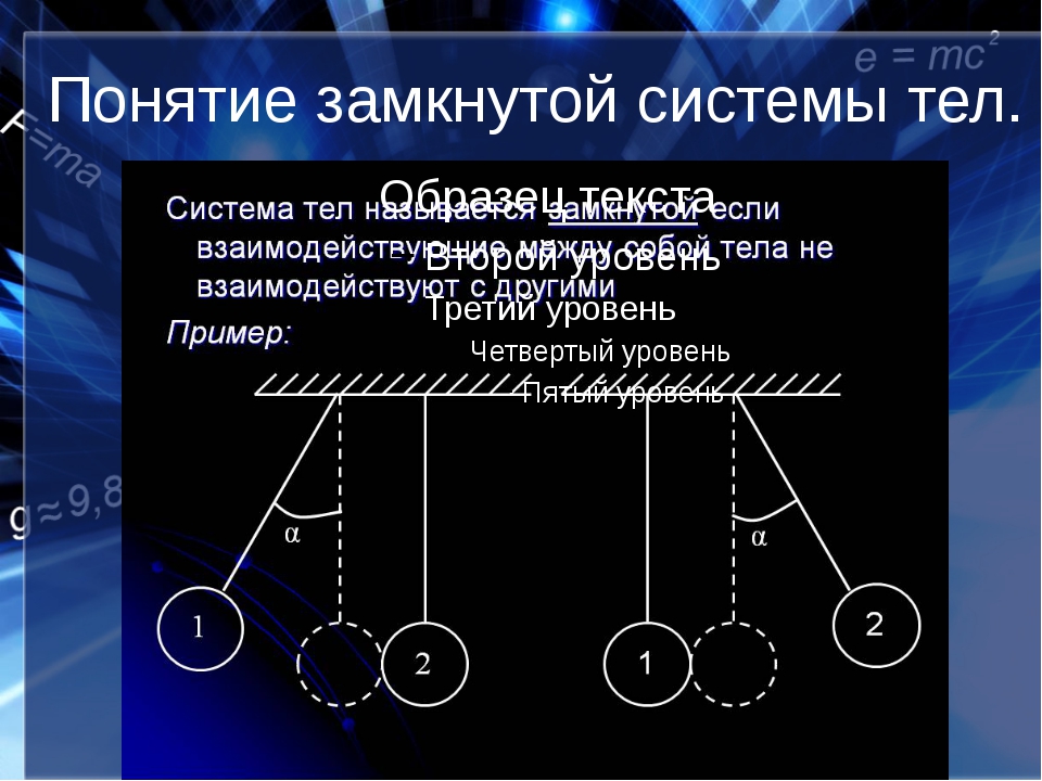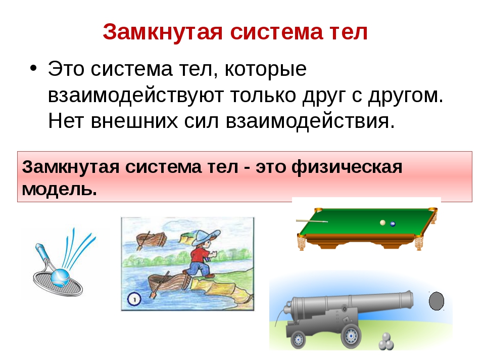 Если два или несколько тел взаимодействуют только между собой (то есть не подвергаются воздействию внешних сил), то эти тела образуют замкнутую систему.