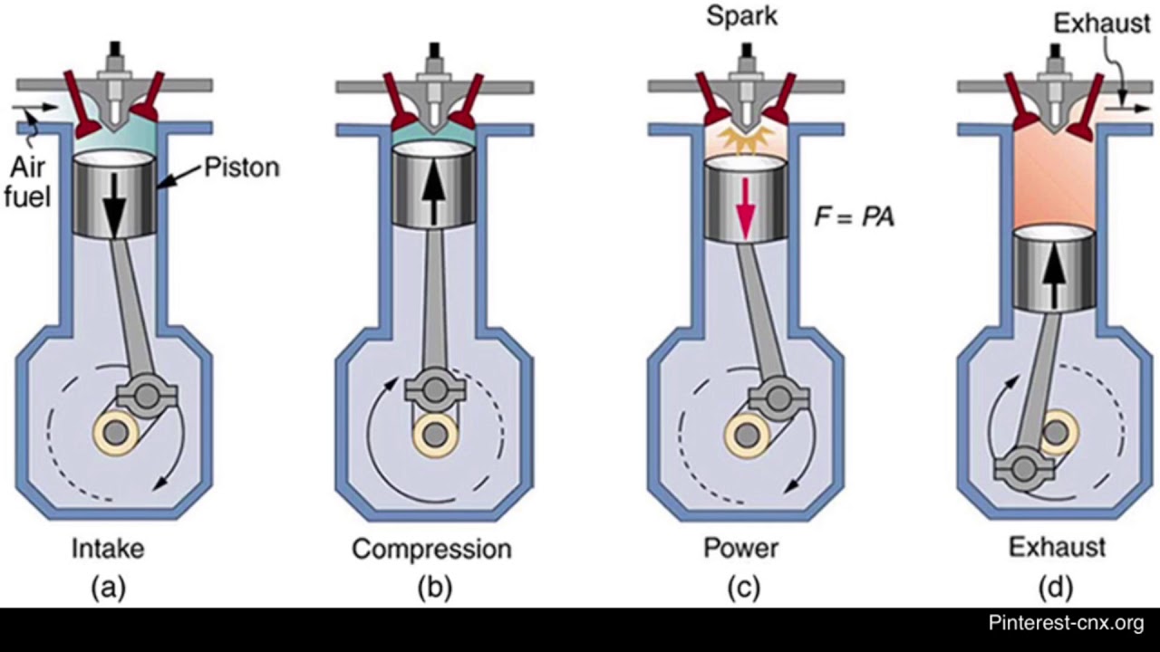 Поршни приводятся в действие бензином, который впрыскивается в двигатель и взрывается свечой зажигания. Поршень перемещается четыре раза в каждом цикле: вниз, чтобы втягивать пары бензина, вверх, чтобы сжимать их, вниз, когда пар воспламеняется и взрывается, и затем вверх, чтобы вытолкнуть выхлоп. В то время как все это происходит, клапаны открываются и закрываются точно в нужный момент, чтобы впустить бензин и выйти из системы выхлопа.