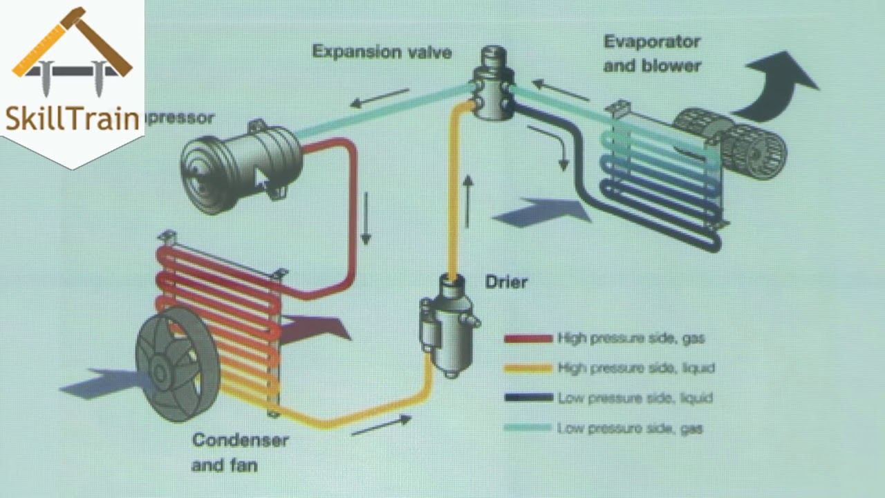 Хладагент, компрессор, расширительный клапан (устройство регулирования расхода), испаритель, конденсатор, трубы и трубки.