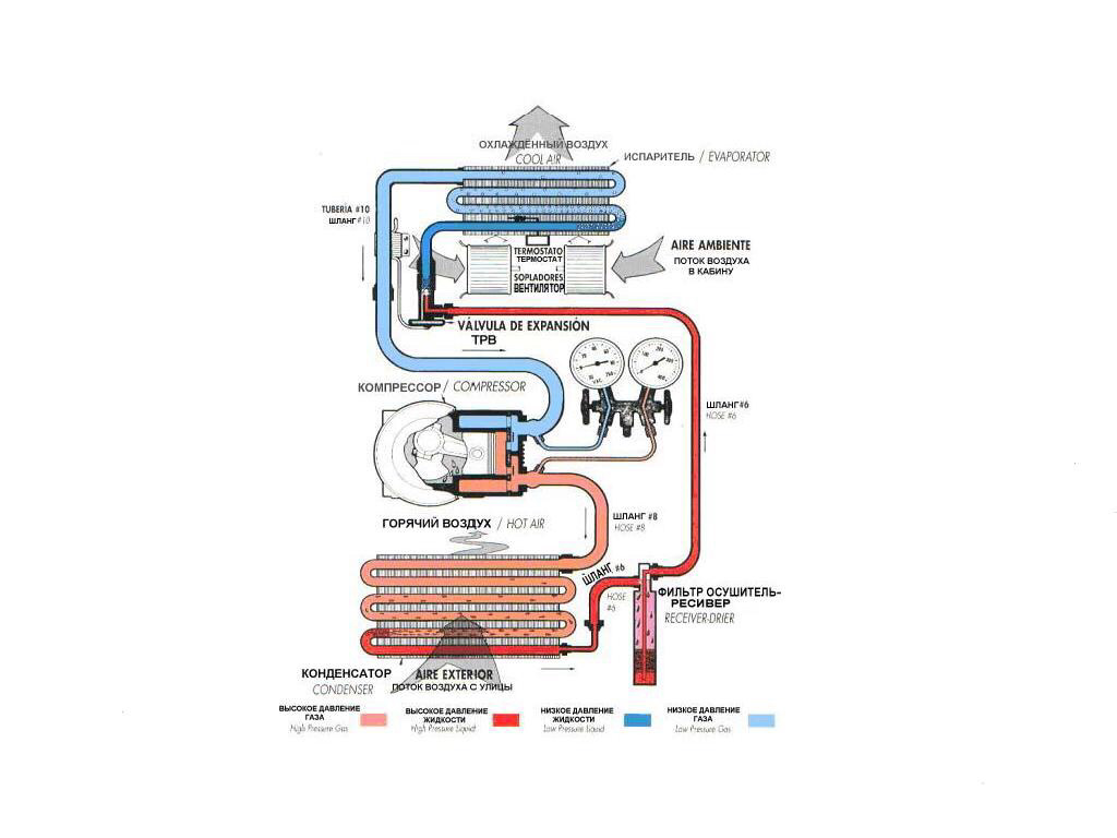 - с низким давлением – магистраль соединения компрессора с испарителем.