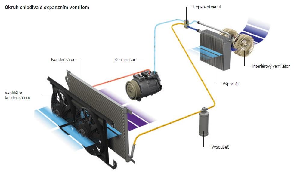 Автомобильная система охлаждения воздуха состоит из следующих основных элементов: компрессор, конденсор, ресивер, расширительный клапан,