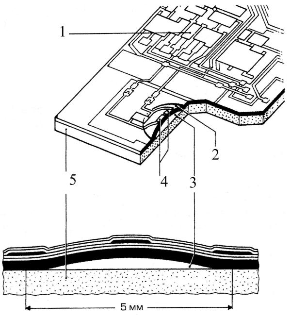 1 – измерительная цепь; 2 – диафрагма; 3 – камера эталонного давления; 4 – измерительный элементы; 5 – керамическая подложка