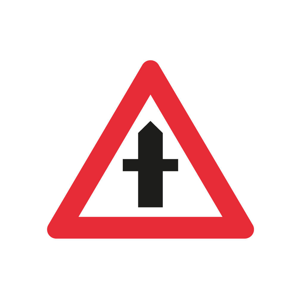 Впереди перекресток. Приоритет через перекресток показан более широкой линией. Вы должны знать об опасности, связанной с пересечением транспортных средств или выездом на главную дорогу.