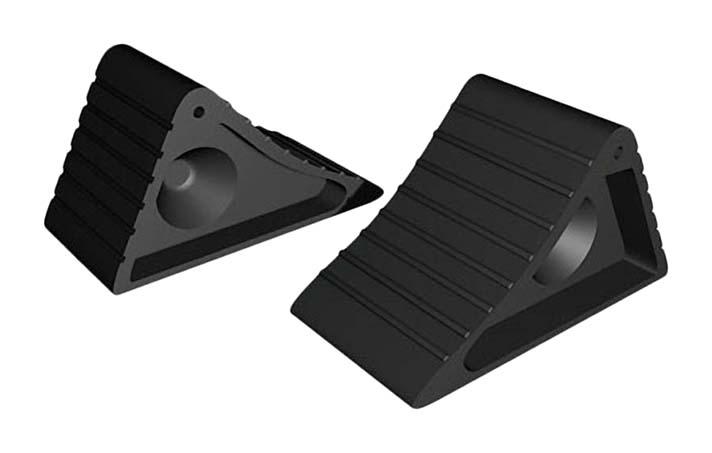 По внешнему виду упоры не отличаются разнообразием. Стандартно это треугольной формы «башмаки», которые устанавливаются под колеса со стороны отката. Реже используются упор-клин, который раскладывается и устанавливается под колесо.