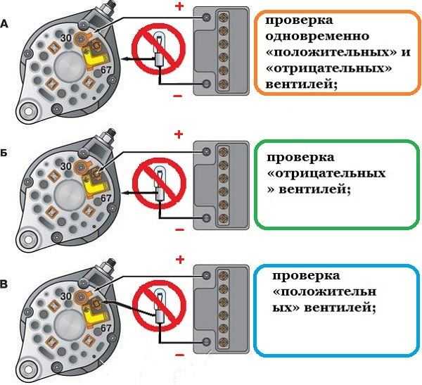 Проверку выполняют, используя лампочку накаливания в качестве светового индикатора. Подключая её к разным клеммам аккумулятора, делаются выводы о работоспособности устройства. Начиная проверку, необходимо убедиться, что пластина выпрямителя имеет плотный контакт с корпусом автомобиля. Один контакт лампочки подсоединяется к корпусу генератора, а другой — к телу крепёжного болта выпрямителя и точкам подключения стартера.