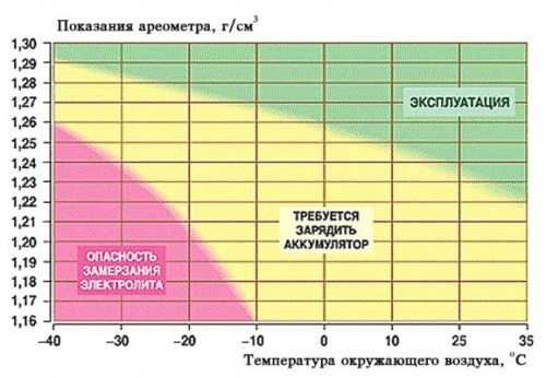 ΠΡΠΈ ΡΠΊΡΠΏΠ»ΡΠ°ΡΠ°ΡΠΈΠΈ Π°ΠΊΠΊΡΠΌΡΠ»ΡΡΠΎΡΠ½ΡΡ Π±Π°ΡΠ°ΡΠ΅ΠΉ Π² ΡΡΠ»ΠΎΠ²ΠΈΡΡ Π½ΠΈΠ·ΠΊΠΈΡ ΡΠ΅ΠΌΠΏΠ΅ΡΠ°ΡΡΡ (ΠΊΠ»ΠΈΠΌΠ°ΡΠΈΡΠ΅ΡΠΊΠΈΠ΅ ΡΠ°ΠΉΠΎΠ½Ρ ΡΠΎ ΡΡΠ΅Π΄Π½Π΅ΠΌΠ΅ΡΡΡΠ½ΠΎΠΉ ΡΠ΅ΠΌΠΏΠ΅ΡΠ°ΡΡΡΠΎΠΉ Π² ΡΠ½Π²Π°ΡΠ΅ ΠΎΡ β50 Π΄ΠΎ β 30 Β°Π‘) ΠΏΡΠΈ ΠΏΠ΅ΡΠ΅Ρ ΠΎΠ΄Π΅ Ρ Π»Π΅ΡΠ½Π΅ΠΉ ΡΠΊΡΠΏΠ»ΡΠ°ΡΠ°ΡΠΈΠΈ Π½Π° Π·ΠΈΠΌΠ½ΡΡ ΠΈ Π½Π°ΠΎΠ±ΠΎΡΠΎΡ ΠΏΡΠΎΠΈΠ·Π²ΠΎΠ΄ΡΡ ΠΈΠ·ΠΌΠ΅Π½Π΅Π½ΠΈΠ΅ ΠΏΠ»ΠΎΡΠ½ΠΎΡΡΠΈ ΡΠ»Π΅ΠΊΡΡΠΎΠ»ΠΈΡΠ°. ΠΡΠΎ ΡΠ²ΡΠ·Π°Π½ΠΎ Ρ ΡΠ΅ΠΌ, ΡΡΠΎ ΡΠ΅ΠΌΠΏΠ΅ΡΠ°ΡΡΡΠ° Π·Π°ΠΌΠ΅ΡΠ·Π°Π½ΠΈΡ ΡΠ»Π΅ΠΊΡΡΠΎΠ»ΠΈΡΠ° Π·Π°Π²ΠΈΡΠΈΡ ΠΎΡ Π΅Π³ΠΎ ΠΏΠ»ΠΎΡΠ½ΠΎΡΡΠΈ. Π’Π°ΠΊ, ΠΏΡΠΈ ΠΏΠ»ΠΎΡΠ½ΠΎΡΡΠΈ 1,09; 1,16; 1,20; 1,24 ΠΈ 1,30 Π³/ΡΠΌ3 ΡΠ»Π΅ΠΊΡΡΠΎΠ»ΠΈΡ Π·Π°ΠΌΠ΅ΡΠ·Π°Π΅Ρ ΠΏΡΠΈ ΡΠ΅ΠΌΠΏΠ΅ΡΠ°ΡΡΡΠ΅ β7, β18, β28, β50 ΠΈ β66 Β°Π‘ ΡΠΎΠΎΡΠ²Π΅ΡΡΡΠ²Π΅Π½Π½ΠΎ. ΠΠΎΡΡΠΎΠΌΡ Π² Π·ΠΈΠΌΠ½Π΅Π΅ Π²ΡΠ΅ΠΌΡ ΠΏΠ»ΠΎΡΠ½ΠΎΡΡΡ ΡΠ»Π΅ΠΊΡΡΠΎΠ»ΠΈΡΠ° ΠΏΠΎΠ²ΡΡΠ°ΡΡ. Π Π»Π΅ΡΠ½Π΅Π΅ Π²ΡΠ΅ΠΌΡ ΠΏΡΠΎΠΈΠ·Π²ΠΎΠ΄ΡΡ ΡΠ½ΠΈΠΆΠ΅Π½ΠΈΠ΅ ΠΏΠ»ΠΎΡΠ½ΠΎΡΡΠΈ, ΡΠ°ΠΊ ΠΊΠ°ΠΊ ΡΠΊΡΠΏΠ»ΡΠ°ΡΠ°ΡΠΈΡ Π±Π°ΡΠ°ΡΠ΅ΠΉ Ρ Π²ΡΡΠΎΠΊΠΎΠΉ ΠΏΠ»ΠΎΡΠ½ΠΎΡΡΡΡ ΡΠ»Π΅ΠΊΡΡΠΎΠ»ΠΈΡΠ°, ΠΎΡΠΎΠ±Π΅Π½Π½ΠΎ ΠΏΡΠΈ ΠΏΠΎΠ»ΠΎΠΆΠΈΡΠ΅Π»ΡΠ½ΡΡ ΡΠ΅ΠΌΠΏΠ΅ΡΠ°ΡΡΡΠ°Ρ , ΠΏΡΠΈΠ²ΠΎΠ΄ΠΈΡ ΠΊ ΡΠΌΠ΅Π½ΡΡΠ΅Π½ΠΈΡ ΠΈΡ ΡΡΠΎΠΊΠ° ΡΠ»ΡΠΆΠ±Ρ. ΠΠΏΠ΅ΡΠ°ΡΠΈΡ ΠΈΠ·ΠΌΠ΅Π½Π΅Π½ΠΈΡ ΠΏΠ»ΠΎΡΠ½ΠΎΡΡΠΈ ΠΏΡΠΎΠ²ΠΎΠ΄ΡΡ ΠΏΡΠΈ Π’Π-2. Π£ΠΌΠ΅Π½ΡΡΠ΅Π½ΠΈΡ ΠΏΠ»ΠΎΡΠ½ΠΎΡΡΠΈ ΡΠ»Π΅ΠΊΡΡΠΎΠ»ΠΈΡΠ° Π΄ΠΎΠ±ΠΈΠ²Π°ΡΡΡΡ ΠΏΡΡΠ΅ΠΌ ΠΎΡΡΠ°ΡΡΠ²Π°Π½ΠΈΡ ΡΠ°ΡΡΠΈ ΡΠ»Π΅ΠΊΡΡΠΎΠ»ΠΈΡΠ° ΠΈ Π΄ΠΎΠ±Π°Π²Π»Π΅Π½ΠΈΡ Π΄ΠΈΡΡΠΈΠ»Π»ΠΈΡΠΎΠ²Π°Π½Π½ΠΎΠΉ Π²ΠΎΠ΄Ρ. ΠΠ»Ρ ΠΏΠΎΠ²ΡΡΠ΅Π½ΠΈΡ ΠΏΠ»ΠΎΡΠ½ΠΎΡΡΠΈ ΡΠ»Π΅ΠΊΡΡΠΎΠ»ΠΈΡΠ° Π² Π°ΠΊΠΊΡΠΌΡΠ»ΡΡΠΎΡΡ Π΄ΠΎΠ±Π°Π²Π»ΡΡΡ ΡΠ°ΡΡΠ²ΠΎΡ ΡΠ΅ΡΠ½ΠΎΠΉ ΠΊΠΈΡΠ»ΠΎΡΡ ΠΏΠ»ΠΎΡΠ½ΠΎΡΡΡΡ 1,40 Π³/ΡΠΌ3.