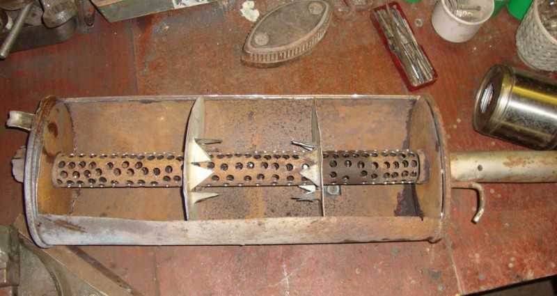 Начать изготовление необходимо с изъятия всех внутренностей глушителя. После этого берем трубу, совпадающую диаметром с трубой глушителя, в месте, где она будет входить в глушитель проделываем отверстия, и привариваем к ней вторую трубу большего диаметра, вставляем в старый корпус и с обеих сторон завариваем.