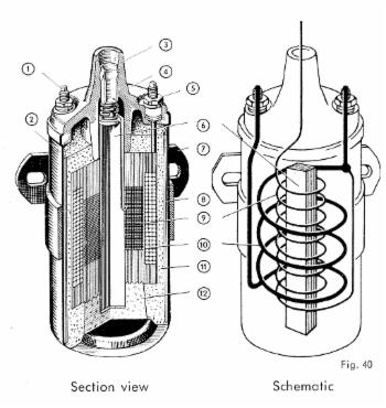 Функция катушки зажигания основывается на законе индукции: катушка зажигания состоит из магнитомягкого железного сердечника, первичной обмотки из медной проволоки с малым количеством витков (сечением примерно 0,75 мм 2 ) и вторичной обмотки из медной проволоки с большим количеством витков (сечением примерно 0,63 мм 2 ). Соотношение витков составляет примерно 1:200.