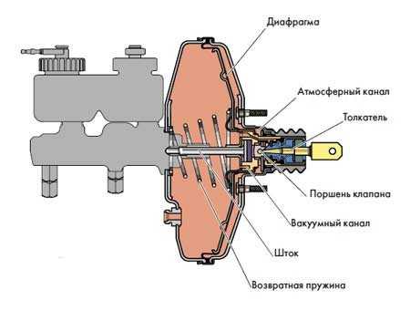 Π Π°Π±ΠΎΡΠ° ΡΠΈΠΏΠΎΠ²ΠΎΠ³ΠΎ Π²Π°ΠΊΡΡΠΌΠ½ΠΎΠ³ΠΎ ΡΠ·Π»Π° ΡΠ΅Π°Π»ΠΈΠ·ΠΎΠ²Π°Π½Π° Π½Π° Π΄ΠΈΡΠ±Π°Π»Π°Π½ΡΠ΅ Π΄Π°Π²Π»Π΅Π½ΠΈΡ Π² ΠΏΠΎΠ»ΠΎΡΡΡΡ ΠΊΠΎΡΠΏΡΡΠ° ΡΡΠΈΠ»ΠΈΡΠ΅Π»Ρ. Π ΡΠ΅Π·ΡΠ»ΡΡΠ°ΡΠ΅ ΠΏΠΎΠ»ΡΡΠ°Π΅ΠΌΠΎΠ³ΠΎ ΡΠ°Π·ΡΡΠΆΠ΅Π½ΠΈΡ Π΄Π²ΠΈΠ³Π°Π΅ΡΡΡ ΡΠΎΠ»ΠΊΠ°ΡΠ΅Π»Ρ, ΠΊΠΎΡΠΎΡΡΠΉ Π²ΠΎΠ·Π΄Π΅ΠΉΡΡΠ²ΡΠ΅Ρ Π½Π° ΡΡΠΎΠΊ ΠΏΠΎΡΡΠ½Ρ ΠΠ’Π¦. ΠΡΠΈ Π½Π°ΠΆΠ°ΡΠΈΠΈ Π½Π° ΠΏΠ΅Π΄Π°Π»Ρ, ΡΡΠΈΠ»ΠΈΡ ΠΏΠ΅ΡΠ΅Π΄Π°ΡΡΡΡ ΠΊ ΠΎΡΡΠ»Π΅ΠΆΠΈΠ²Π°ΡΡΠ΅ΠΌΡ ΠΊΠ»Π°ΠΏΠ°Π½Ρ, ΡΠΎΠ΅Π΄ΠΈΠ½ΡΡΡΠ΅ΠΌΡ ΠΎΠ±Π΅ ΠΏΠΎΠ»ΠΎΡΡΠΈ. Π ΠΈΡΠΎΠ³Π΅ ΠΏΠΎΠ½ΠΈΠΆΠ°Π΅ΡΡΡ Π΄Π°Π²Π»Π΅Π½ΠΈΠ΅ Π² Π°ΡΠΌΠΎΡΡΠ΅ΡΠ½ΠΎΠΉ ΠΊΠ°ΠΌΠ΅ΡΠ΅, Π΄ΠΈΠ°ΡΡΠ°Π³ΠΌΠ° Π²ΡΠ³ΠΈΠ±Π°Π΅ΡΡΡ ΠΈ Π΄Π°Π²ΠΈΡ Π½Π° ΡΡΠΎΠΊ. ΠΠ’Π¦. ΠΠΎΡΠ»Π΅ ΠΎΡΠ²ΠΎΠ±ΠΎΠΆΠ΄Π΅Π½ΠΈΡ ΠΏΠ΅Π΄Π°Π»ΠΈ ΠΏΡΠΎΠΈΡΡ ΠΎΠ΄ΠΈΡ Π²ΠΎΠ·Π²ΡΠ°Ρ Π²ΡΠ΅Ρ ΡΠ΅Π³ΠΌΠ΅Π½ΡΠΎΠ², ΡΠΎΠΎΡΠ²Π΅ΡΡΡΠ²Π΅Π½Π½ΠΎ Π²ΡΡΠ°Π²Π½ΠΈΠ²Π°Π΅ΡΡΡ Π΄Π°Π²Π»Π΅Π½ΠΈΠ΅ Π² ΠΎΠ±Π΅ΠΈΡ ΠΏΠΎΠ»ΠΎΡΡΡΡ . ΠΠΎΠ·Π²ΡΠ°ΡΠ½Π°Ρ ΠΏΡΡΠΆΠΈΠ½Π° Π² ΡΡΠΎΠΌ ΡΠ»ΡΡΠ°Π΅ ΠΏΠ΅ΡΠ΅ΠΌΠ΅ΡΠ°Π΅Ρ Π΄ΠΈΠ°ΡΡΠ°Π³ΠΌΡ Π² ΠΈΡΡ ΠΎΠ΄Π½ΠΎΠ΅ ΡΠΎΡΡΠΎΡΠ½ΠΈΠ΅. Π ΠΎΠ±ΡΠ΅ΠΌ, ΠΏΡΠΈΠ½ΡΠΈΠΏ ΡΠ°Π±ΠΎΡΡ Π²Π°ΠΊΡΡΠΌΠ½ΠΎΠ³ΠΎ ΡΡΠΈΠ»ΠΈΡΠ΅Π»Ρ ΡΠΎΡΠΌΠΎΠ·ΠΎΠ², Π΄ΠΎΡΡΠ°ΡΠΎΡΠ½ΠΎ ΠΏΡΠΎΡΡ, ΠΊΠ°ΠΊ ΠΈ Π΅Π³ΠΎ ΠΊΠΎΠ½ΡΡΡΡΠΊΡΠΈΠ²Π½ΠΎΠ΅ ΡΠ΅ΡΠ΅Π½ΠΈΠ΅. ΠΠ° Π΄Π΅ΡΡΡΠΈΠ»Π΅ΡΠΈΡ ΠΈΡΠΏΠΎΠ»ΡΠ·ΠΎΠ²Π°Π½ΠΈΡ Π² Π°Π²ΡΠΎΠΌΠΎΠ±ΠΈΠ»ΡΠ½ΠΎΠΉ ΠΈΠ½Π΄ΡΡΡΡΠΈΠΈ ΠΠ£ ΠΏΡΠ°ΠΊΡΠΈΡΠ΅ΡΠΊΠΈ Π½Π΅ ΠΏΠΎΠ΄Π²Π΅ΡΠ³Π°Π»ΡΡ Π·Π½Π°ΡΠΈΡΠ΅Π»ΡΠ½ΡΠΌ ΠΈΠ·ΠΌΠ΅Π½Π΅Π½ΠΈΡΠΌ.