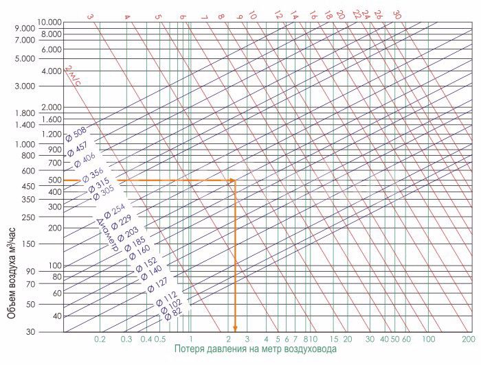 - По определенной в п.1 скорости и на основании проектного расхода воздуха находят начальную потерю напора (на 1 м длины воздуховода). Для этого служит нижеприведенная диаграмма.