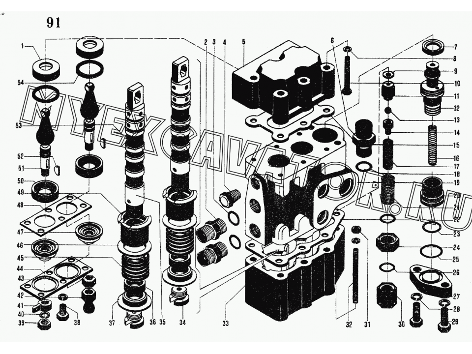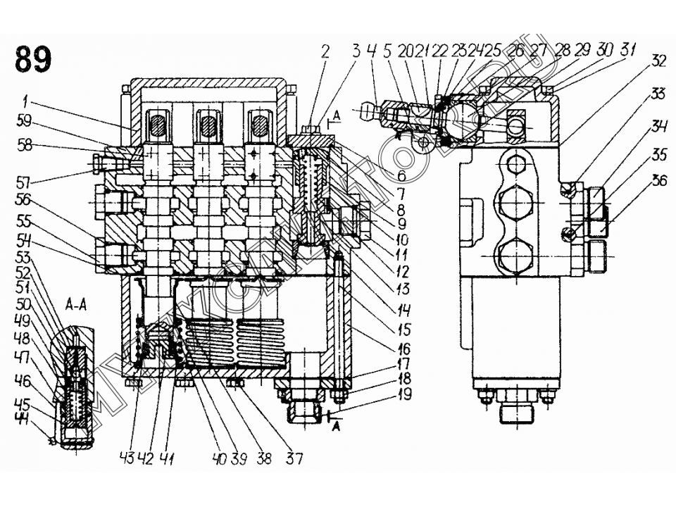 Распределитель установлен на передней стенке кабины. Он состоит из корпуса, верхней и нижней крышек, трех золотников, перепускного и предохранительного клапанов.