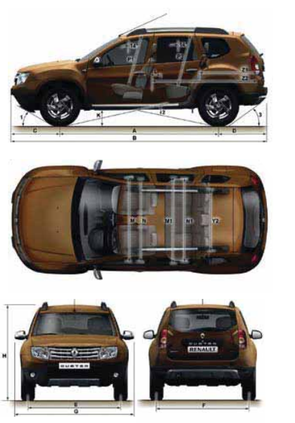 Предлагаем вашему вниманию линейные размеры кузова Рено Дастер на этих схематических фото.
