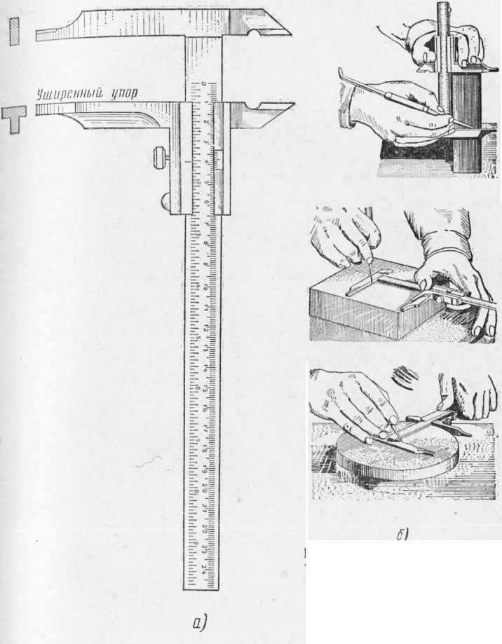 Разметку выполняют разметочным инструментом. Для нанесения прямых линий применяют измерительную и специальную разметочную линейки, угольник, рейсмус, штангенциркуль.