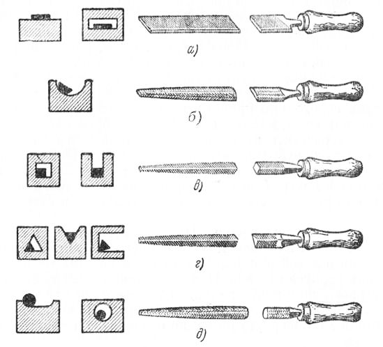 Пазы различной формы проделывают стамесками и долотами. Долото отличается от стамески наличием металлического кольца на конце ручки. Стамеска имеет более тонкое лезвие, применяется для выборки небольших пазов, снятия фасок. Долото служит для выдалбливания отверстий.
