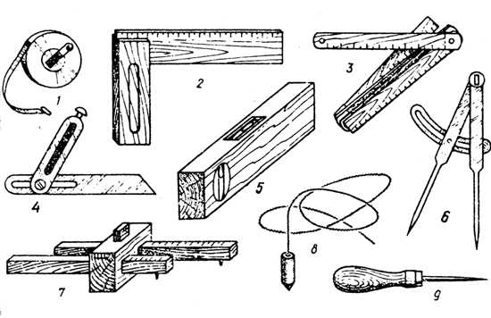 При разметке используют разметочные инструменты и при-способления: шаблон, рулетку, циркуль, шест с рамкой.