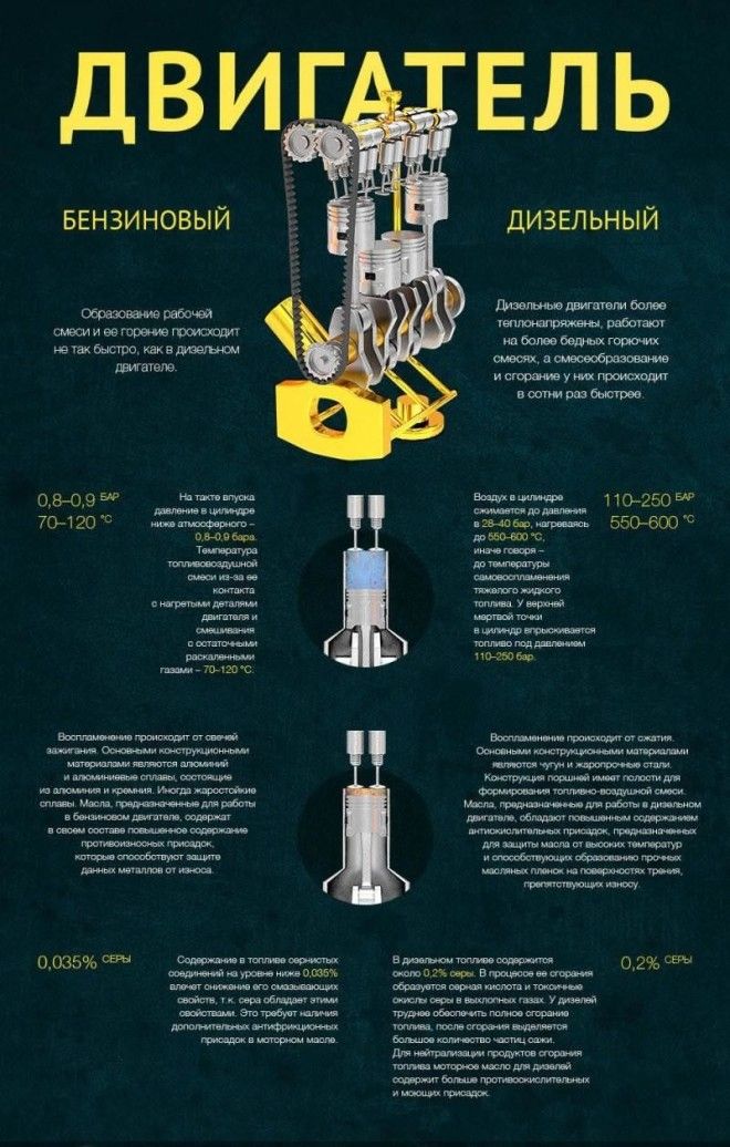 Как бензиновые, так и дизельные двигатели используют четыре такта впуска, сжатия, сгорания и выпуска.