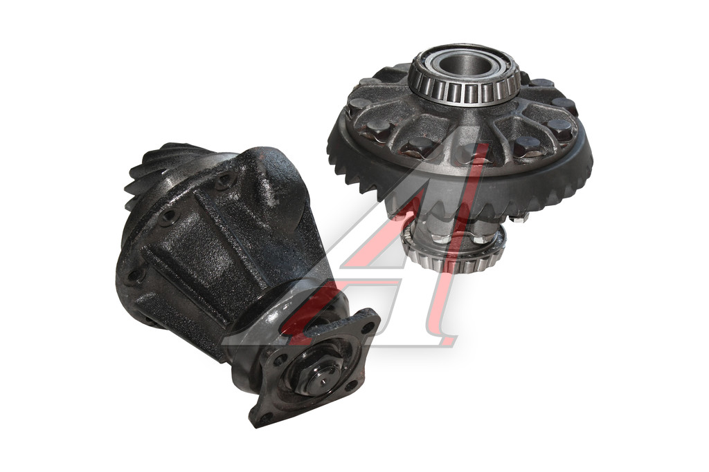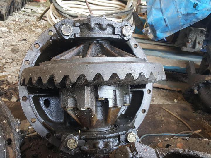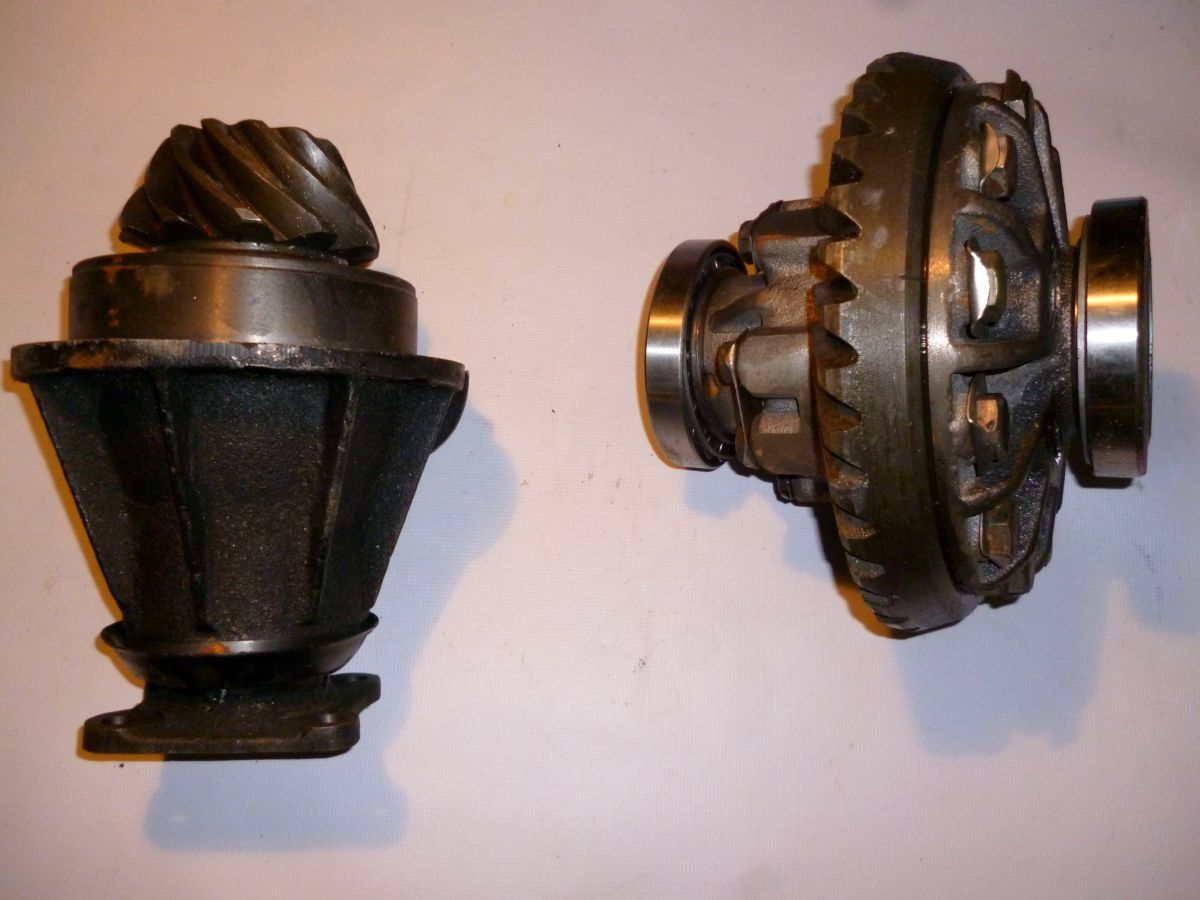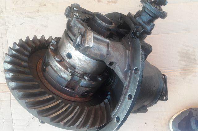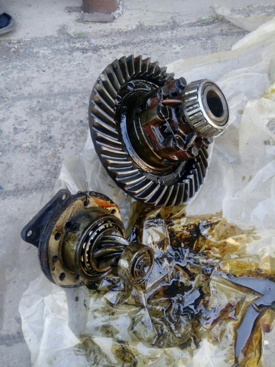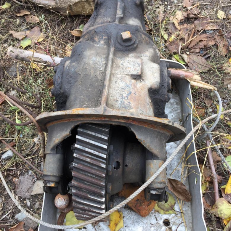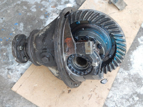 Это открытый дифференциал. На вал-шестерню насажена шестерня. Собственно, эта шестерня и есть карданный вал. Эта шестерня вращает большое зубчатое колесо. Несущий блок, установленный на зубчатом венце. Он состоит из двух конических шестерен (планетарных шестерен) и двух конических (солнечных) шестерен. Солнечные конические шестерни соединены с полуосью заднего моста. Корпус дифференциала закрывает весь этот узел. А кожух полуоси закрывает полуось.