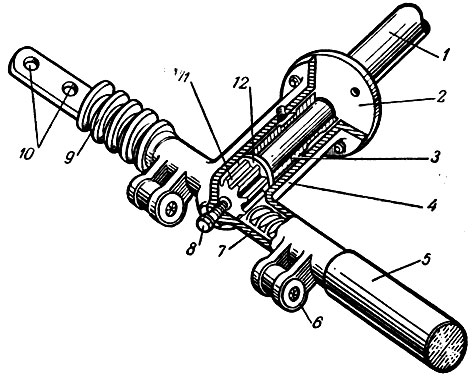 Крутящий момент от руля на рейку передается посредством зубчатой передачи. Вал, который соединен с рулевым колесом, имеет витую зубчатую нарезку. Он с небольшим отклонением от перпендикуляра, равным примерно 10-15 °С, входит в зацепление с зубьями рейки. При вращении руля рейка перемещается в одну либо другую сторону, воздействуя на рулевые тяги, которые, в свою очередь, шарнирно соединены со ступицей через наконечники.