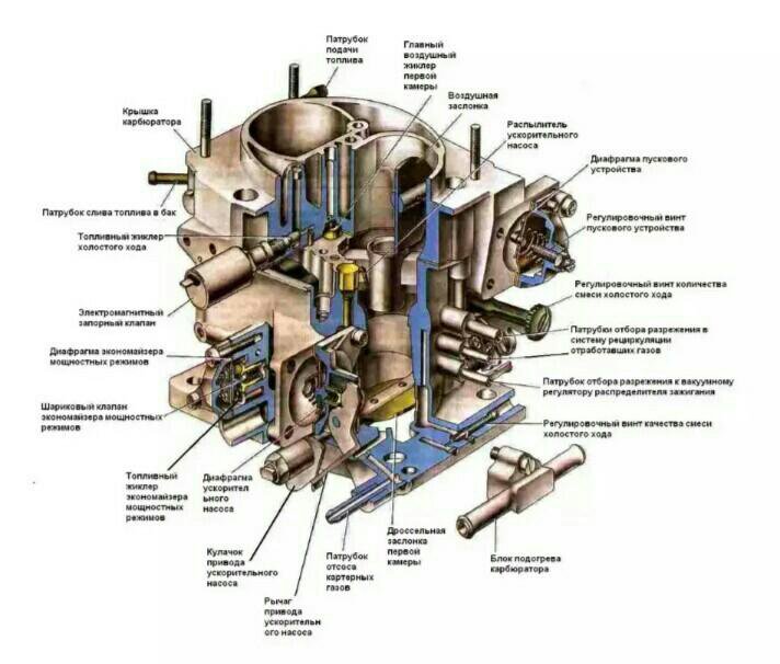 В корпусе можно обнаружить поплавковую камеру и 2 камеры для смеси горючего с диффузорами. Кроме того, здесь же присутствуют экономайзер с эконостатом, каналы для прохода топлива и воздуха, заслонки дросселя, винты регулировок и настроек.
