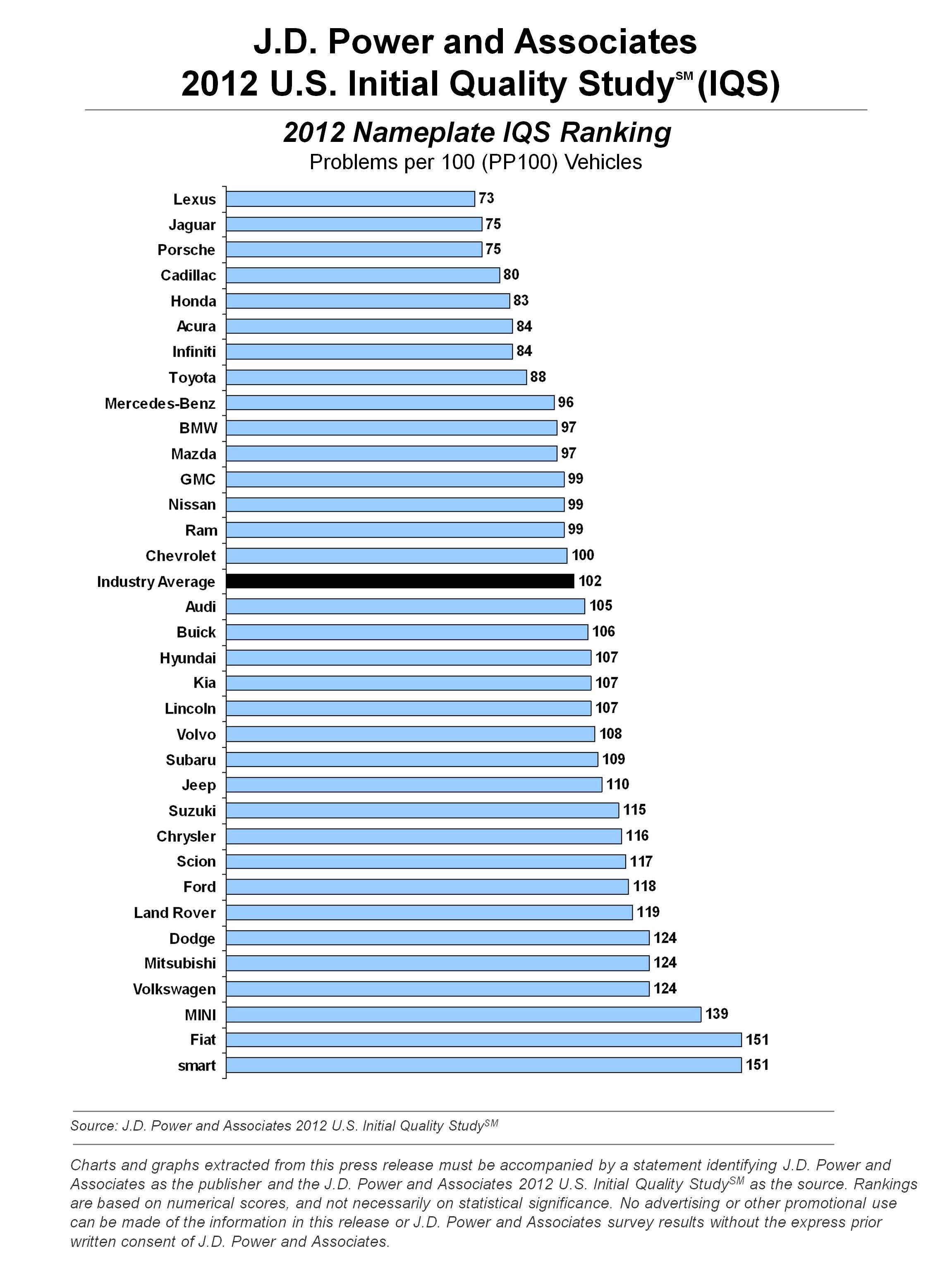 Молодежный бренд компании Toyota Scion находиться в плачевном состоянии по уровню продаж, но точно не по качеству. Показатель бренда улучшился до 121 проблемы на 100 авто, упав на 13 пунктов, по сравнению с исследованием прошлого года.
