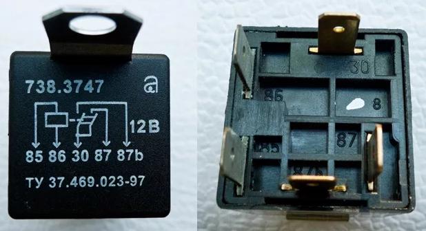 Выводы автомобильных реле маркируются в соответствии с международным электротехническим стандартом для автопрома. Два вывода обмотки пронумерованы цифрами «85» и «86». Выводы контактной «двойки» или «тройки» (замыкающие или переключающие) обозначаются как «30», «87» и «87а».