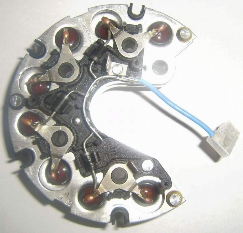 В пластину, которая лежит снизу и имеет контакт с корпусом генератора, запрессовываются диоды с отрицательной полярностью (Polarity Negative). Диодный мост собирается в порядке, обратном разборке.