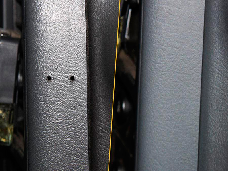 | Несколько неприятных глубоких выбоин в верхней части виниловой дверной панели. | Умный ремонт отделки салона вскоре восстановил внешний вид автомобиля. | |