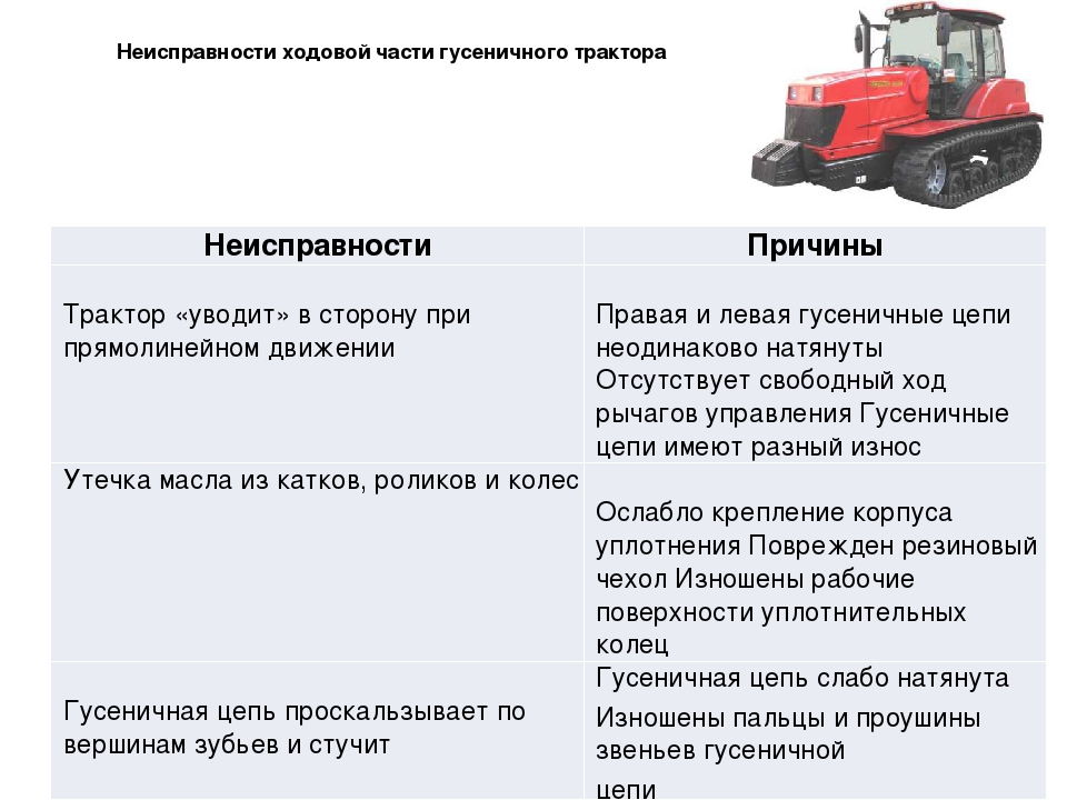 У гусеничной цепи происходит износ отверстий проушин, беговых дорожек, почвозацепов, цевок в местах прикосновения с колесными ведущими зубьями. Это основные неисправности ходовой части гусеничного трактора. Ряд деформированных звеньев выравнивается через гидравлический пресс. Перечень небольших трещин подлежит сварке. Изношенные проушины, цевки идут на замену. Во время восстановления звеньев тракторных гусениц применяется деформирование с обжатием, заливкой жидким металлом, электродуговой наплавкой.