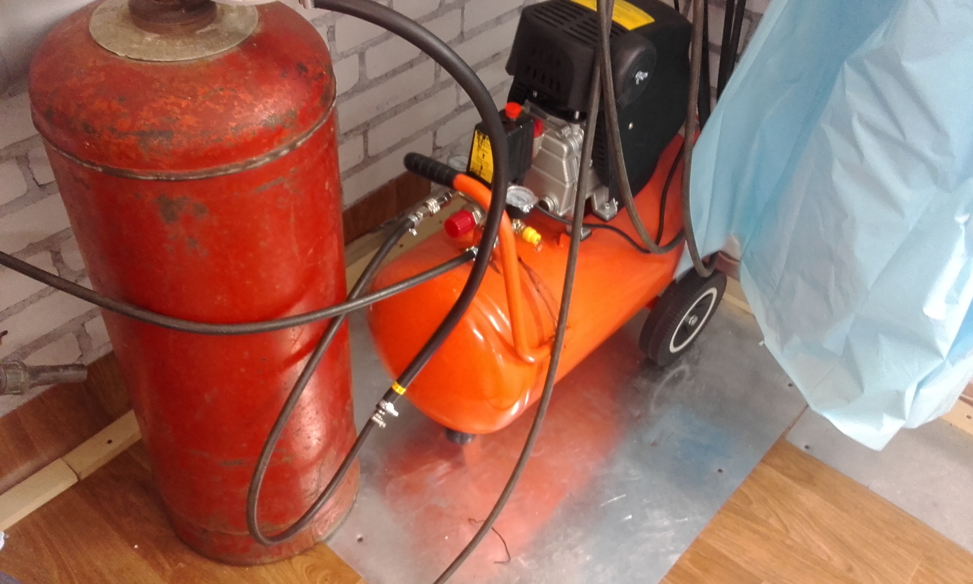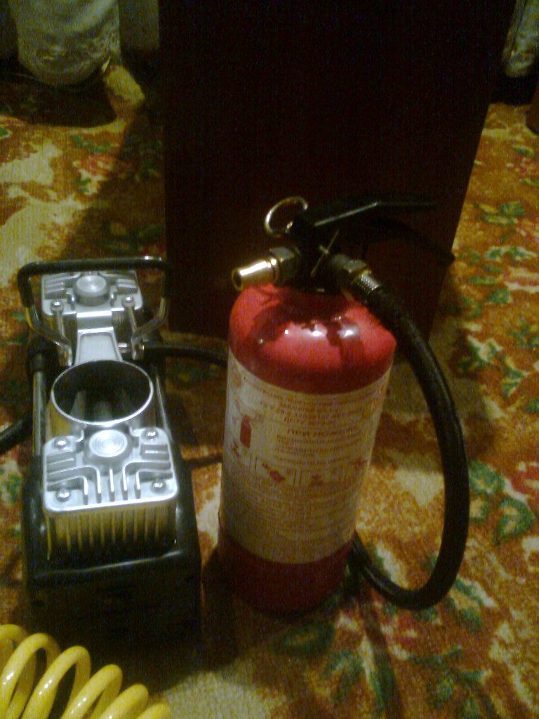 Если требуется больший объём воздуха, лучше всего в качестве ресивера при изготовлении компрессора своими руками использовать огнетушитель или старый газовый баллон.