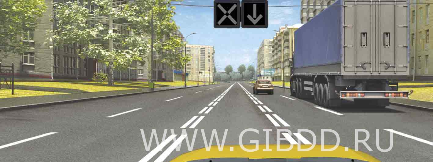 Вы не можете обогнать грузовой автомобиль, так как красный сигнал реверсивного светофора запрещает использовать для движения в данном направлении другие полосы, кроме крайней правой.