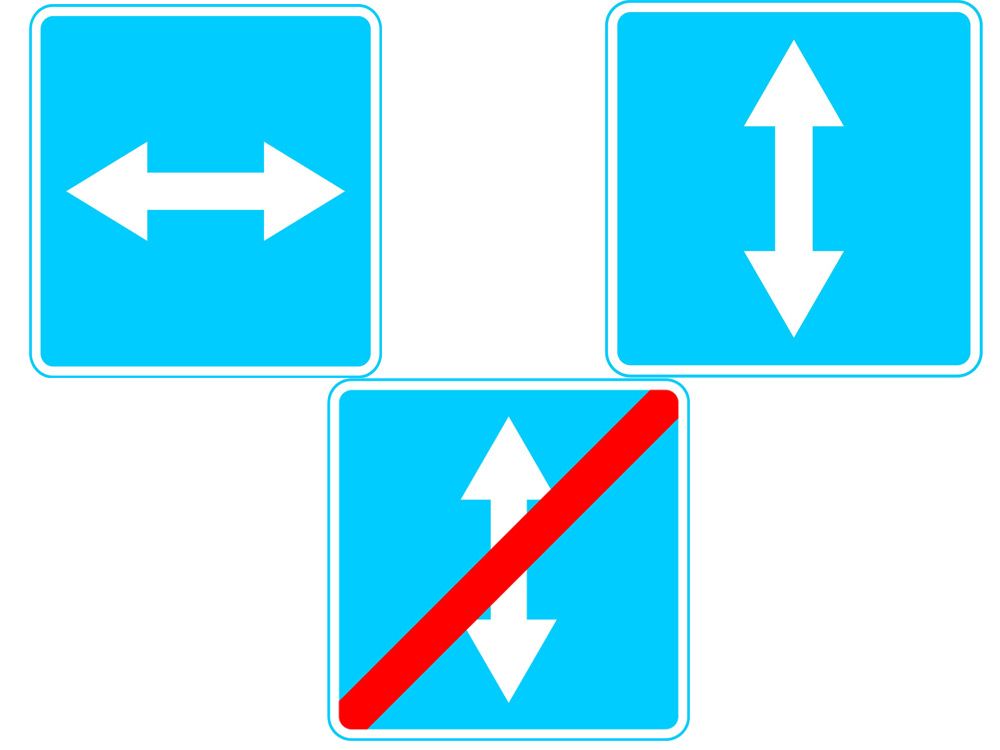 Символ 5.10 говорит о том, что водитель выезжает на дорогу, на которой есть реверсивное движение. Это – синий квадрат с двухсторонней стрелкой, которая расположена уже не вертикально, а горизонтально. Этот объект размещают перед перекрестками. Автомобилист, поворачивающий на полотно с реверсивным движением, обязан находиться на крайней правой полосе. Перестраиваться на таких участках можно только после того, как водитель убедится в том, что это разрешено светофорами.