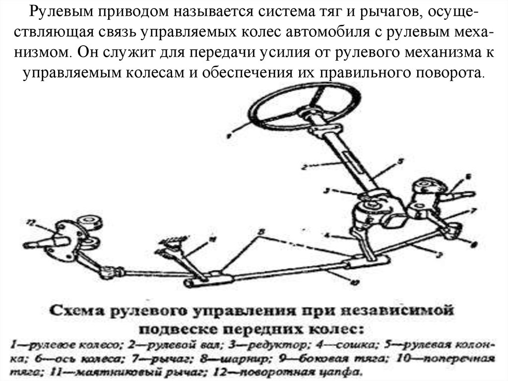 Усилие, требуемое для поворота рулевого колеса, передается колесам с помощью системы поворотных рычагов. Эти рычаги позволяют перемещать колеса вверх и вниз для работы подвески без изменения угла поворота.