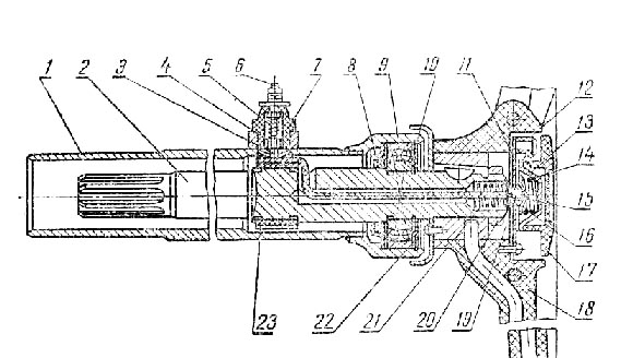 Вал установлен в верхнем и нижнем шарикоподшипниках трубы 4 рулевой колонки. В верхней части этой трубы расположен фиксатор 2 с пружиной. Конус фиксатора входит в лунки трубы, когда рулевое колесо повернуто от среднего положения вправо или влево на угол 42°. Этому положению колеса соответствует полное выключение гидроподжимной муфты, вызванное открытием клапана плавного сброса давления.