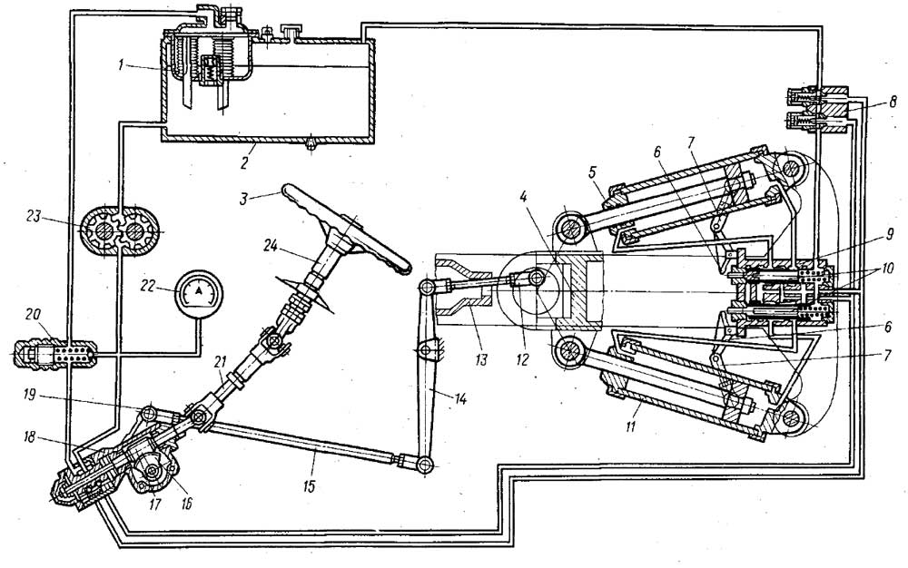 К гидравлической части относятся гидравлический насос 17, клапан 11 расхода, распределитель 13, запорный клапан 5, два цилиндра 19 и 20 поворота, бак 8 с заборным фильтром 10 и фильтром 9 на линии слива, а также трубопроводы для соединения гидравлических узлов.