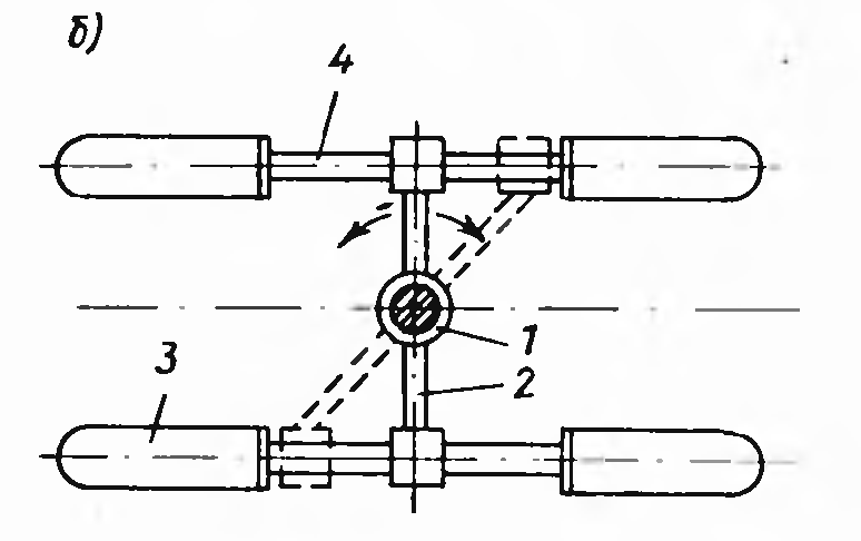 При работе основного привода (электродвигателя 7) червячная передача, приводит во вращение конические шестерни, которые перекатываются по верхней горизонтальной конической шестерне, остающейся неподвижной вследствие тормозящих свойств червячной передачи. Поперечина при этом поворачивается в горизонтальной плоскости и вращает вертикальный вал с шестерней.